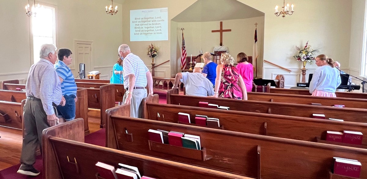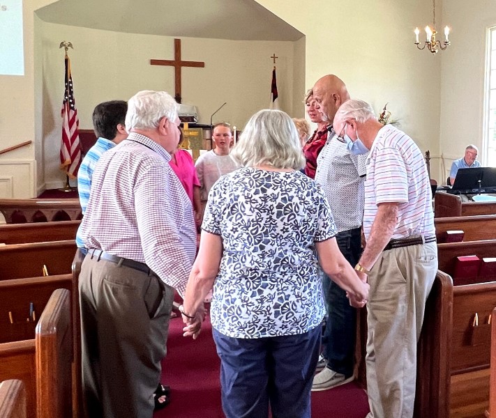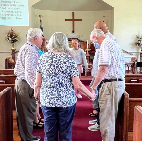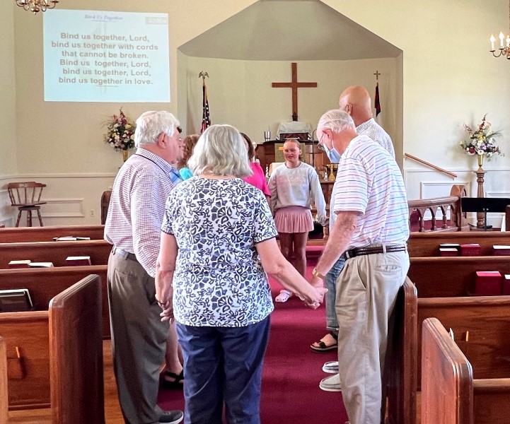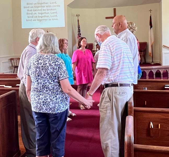 Gather in the center aisle, join hands for the...