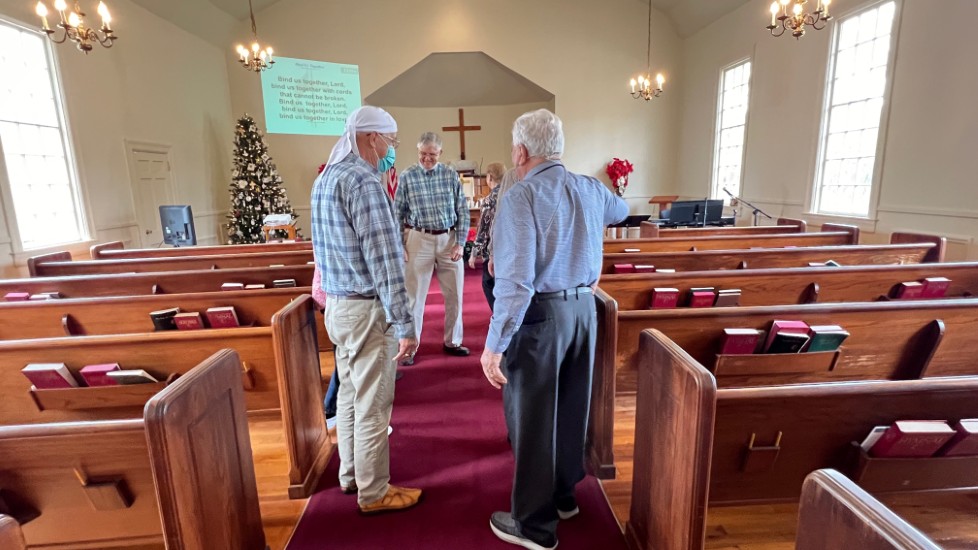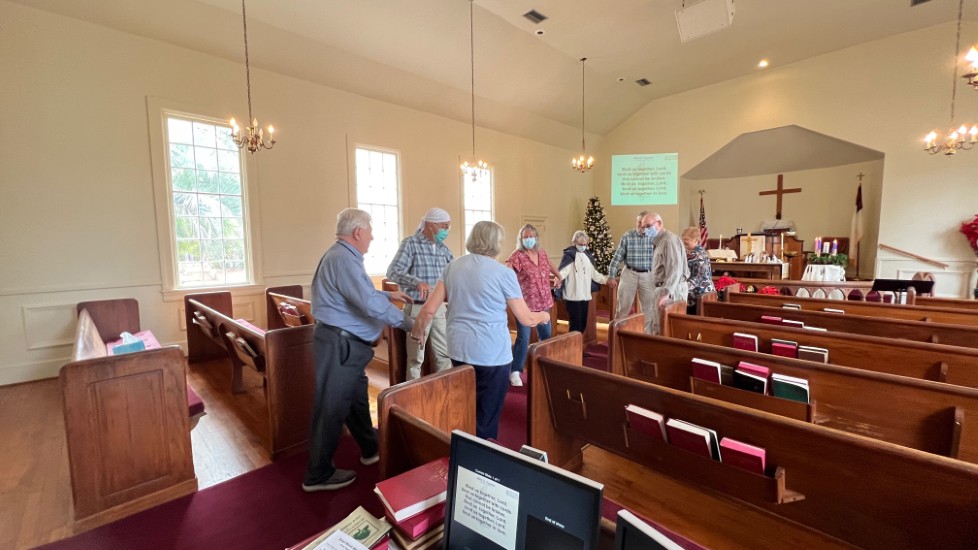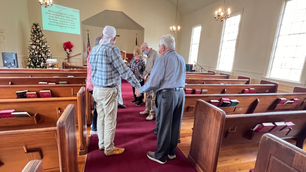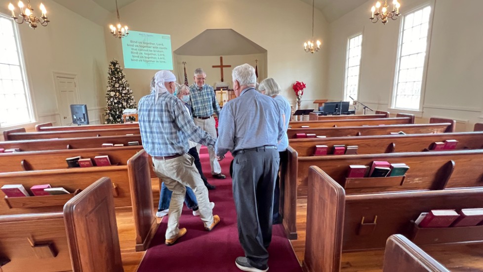Gather in center aisle, join hands, sing "Bind Us Together"...
