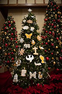 A Chrismon tree is an evergreen tree often placed in the chancel or nave of a church during Advent and Christmastide. The Chrismon tree was first used by North American Lutherans in 1957, although the practice has spread to other Christian denominations, including Anglicans, Catholics, Methodists, and the Reformed. As with the Christmas tree, the evergreen tree itself, for Christians, "symbolizes the eternal life Jesus Christ provides". However, the Chrismon tree differs from the traditional Christmas tree in that it "is decorated only with clear lights and Chrismons made from white and gold material", the latter two being the liturgical colours of the Christmas season.