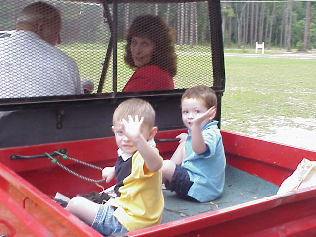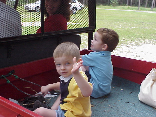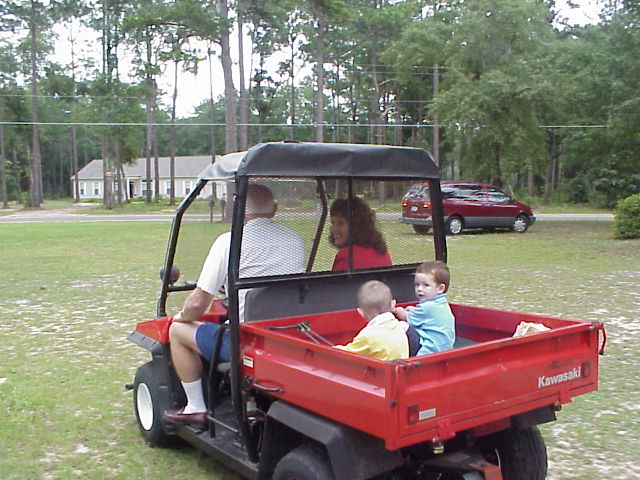 Digital Church Photos Sunday August 4, 2002 Rev. Steven Riddle "in costume" Carter Singletary and David Zody take a ride in the "Mule" after the service