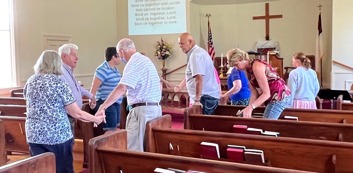 Gather in the center aisle, join hands for the...