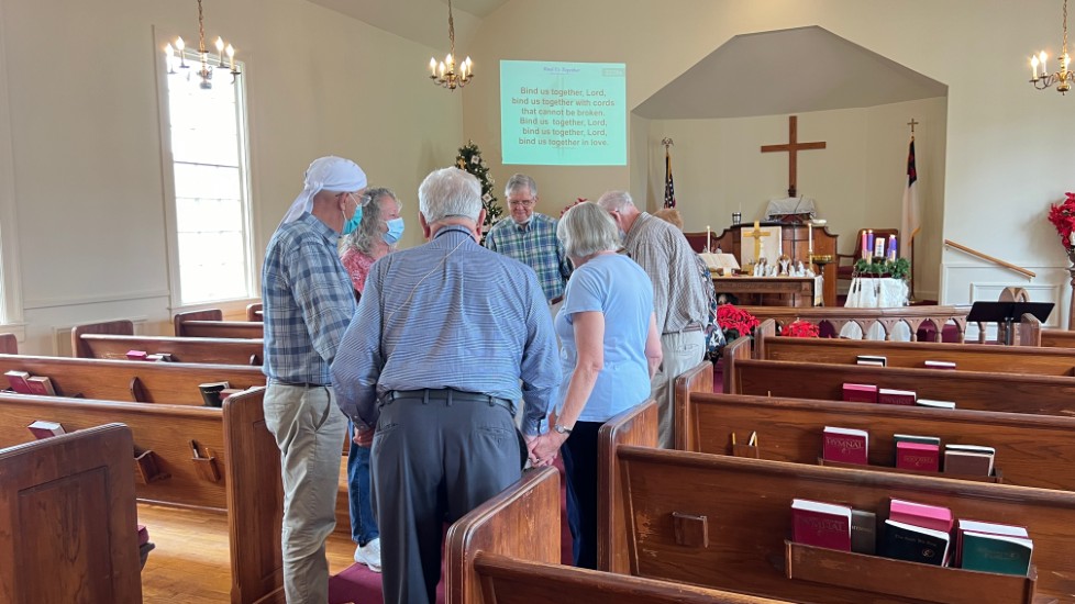 Gather in center aisle, join hands, sing "Bind Us Together"...